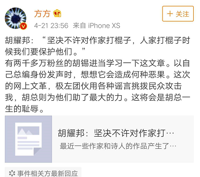 他也是打着作家的旗号在国内活动,并在网上屡屡发表反动言论,方方转发的这篇拉虎皮扯大旗文章的作者看到被方方转发后,觉得势头不对立即删除了文章,只留下方方在风中凌乱。再者,随着诸多猛料的爆出,尤其是方方别墅事件更多证据爆出,种种迹象表明,方方日记境外出版的事件已经引发关注,尤其是声明海外版方方日记的详情况,并撤回海外版的发售,并且任由国外势力把方方日记包装成刺向中国人自己的利剑,