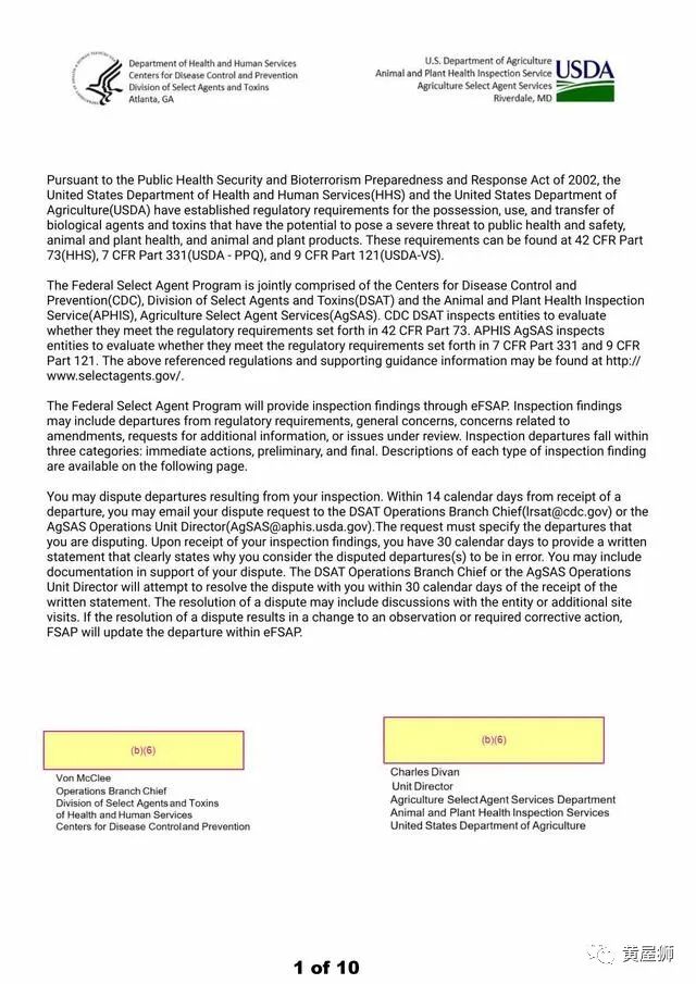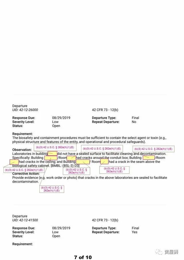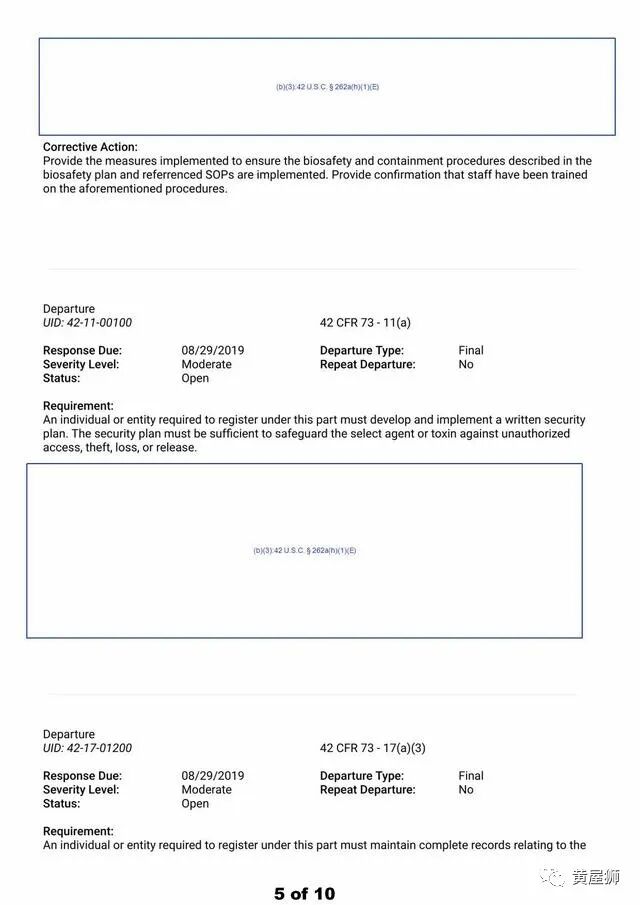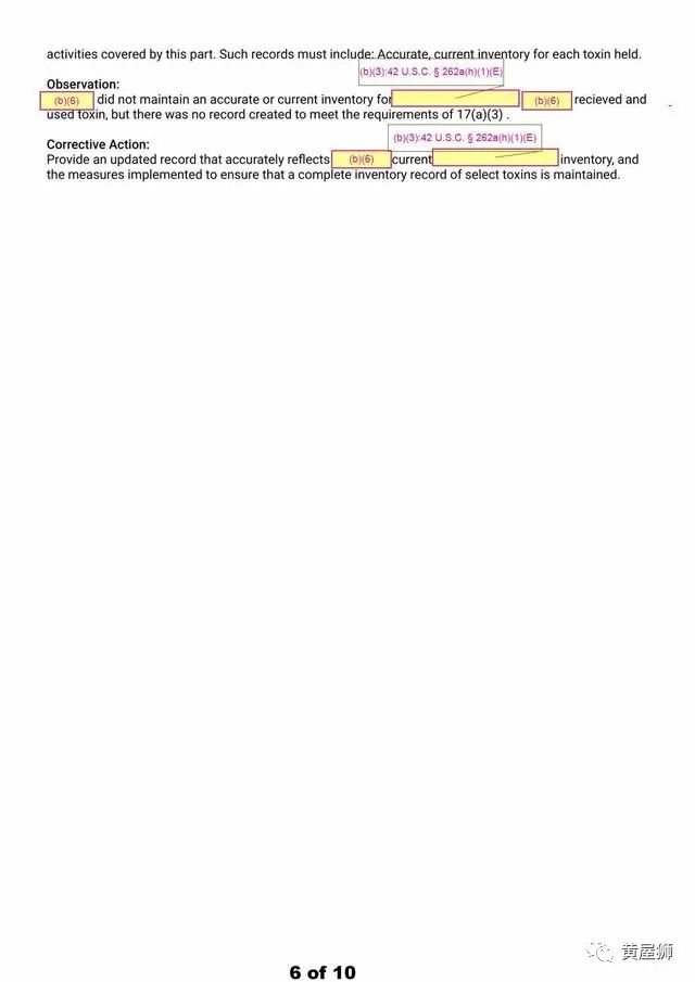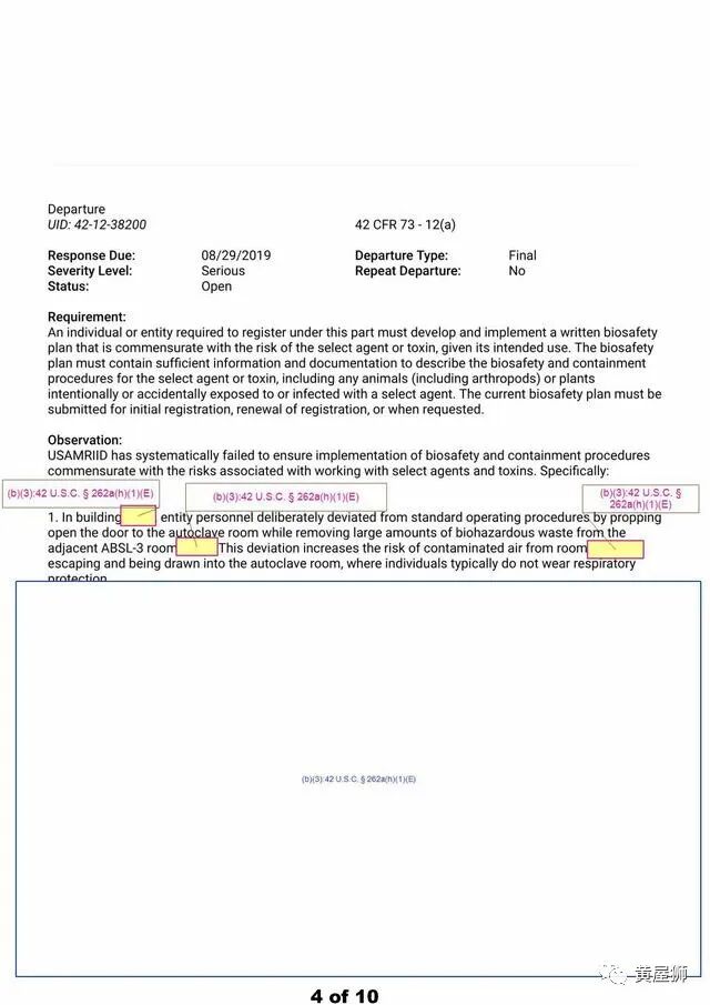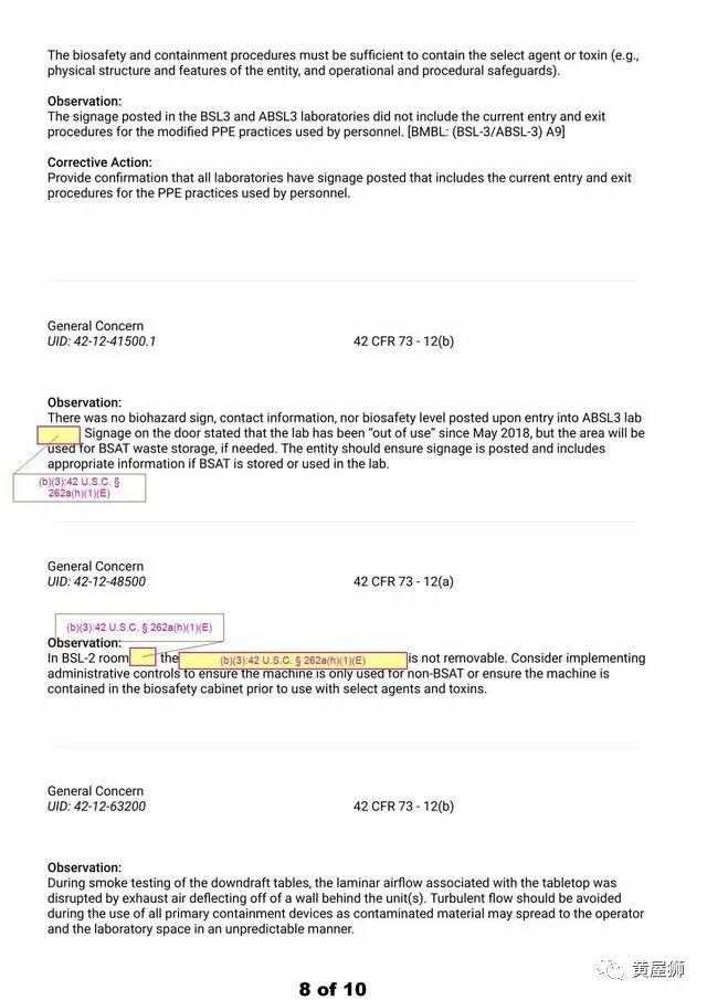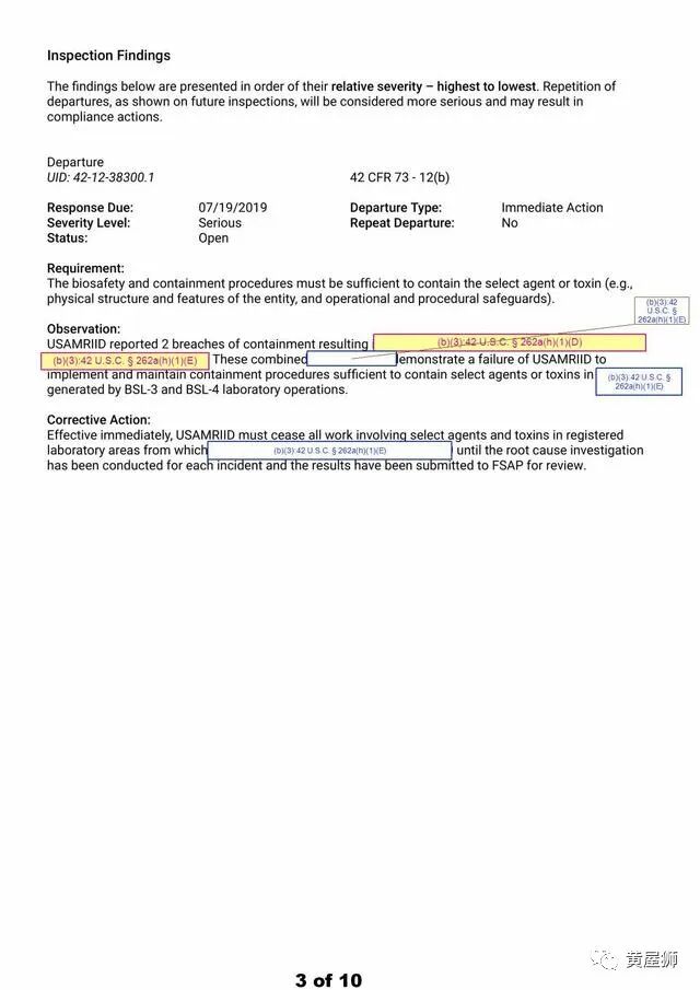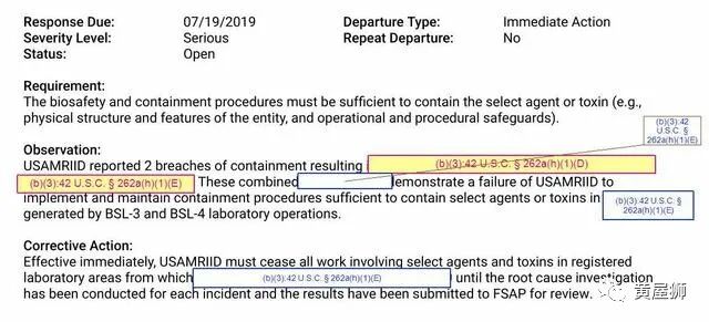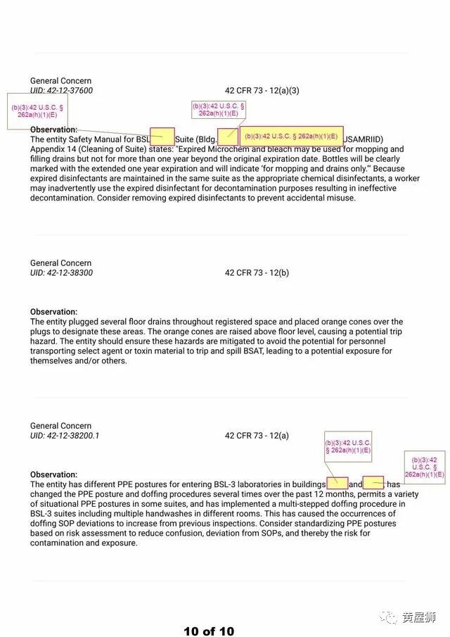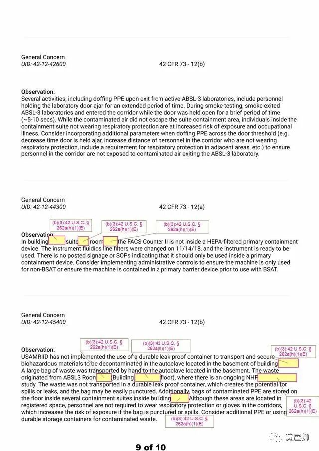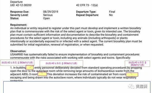 《新闻邮报》通过《信息自由法》要求获得的一份检查结果报告,详细说明了疾病预防控制中心检查期间以及报告问题的美国医学研究所雇员发现的一些观察结果。下面就是这份报告的原文披露的重要泄露信息。(报告中掩盖了大部分重要关键细节部分,如图标志和方框为隐含部分,没有公开),全文附在文末,一共10页。