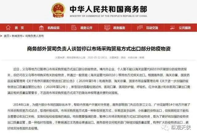 第一张牌:中国商务部暂停以市场采购贸易方式出口防疫物资。