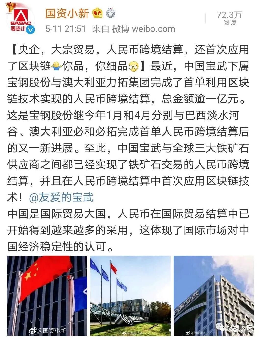 中国宝武继2020年1月和4月分别与巴西淡水河谷、澳大利亚必和必拓两家铁矿石供应商完成了首单人民币跨境结算后,5月11日再传捷报:宝武和澳大利亚力拓集团完成了总额超过1亿元的人民币跨境结算,而且使用了区块链技术。
