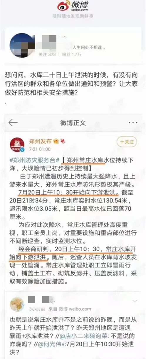 并且7月20号10:30分开始泄洪,直到21号凌晨1点才在“郑州发布”看到泄洪消息。为什么泄洪时不向行洪区群众和单位通知和预警,让大家做好防范?水库泄洪,因为无法可依,常常导致行洪区群众生命财产安全遭遇重大损失。