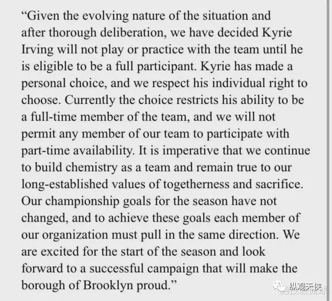 就在刚刚,篮网官方发表声明,经过球队的慎重考虑,在欧文能够完全履行球队责任之前,他不会参加球队的任何训练和比赛。“欧文做出了他的选择,我们尊重他,但这一选择让他无法成为球队的全职人员。我们不允许球队任何球员以兼职的形式参与,我们需要建立化学反应并树立长期的价值观,以及我们的冠军目标。”