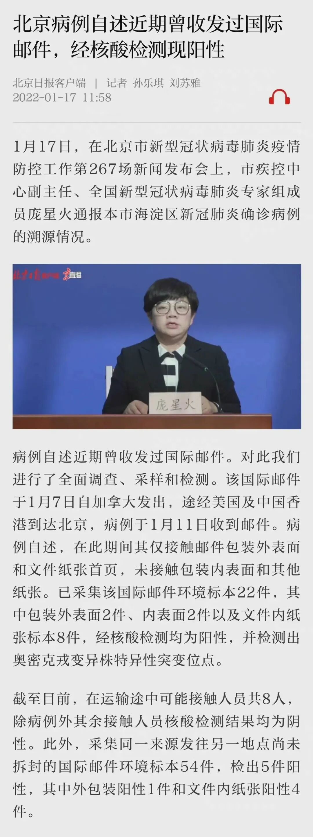 北京病例自述近期曾收发过国际邮件,