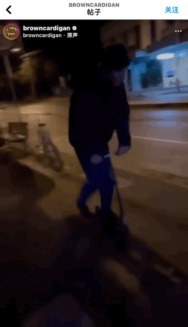 就这样,不到几小时,一个视频被传到了一个名叫【Brown Cardigan】的Ins账号上,视频内容正是一名男子尝试骑滑板车却不慎砸向店家玻璃的画面。