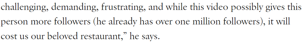 店家也生气并无奈的表示:这个视频可能会让这个博主因此获得大批粉丝,尽管他已经有超过一百万粉丝了,但他的行为却毁掉了我们心爱的餐厅。