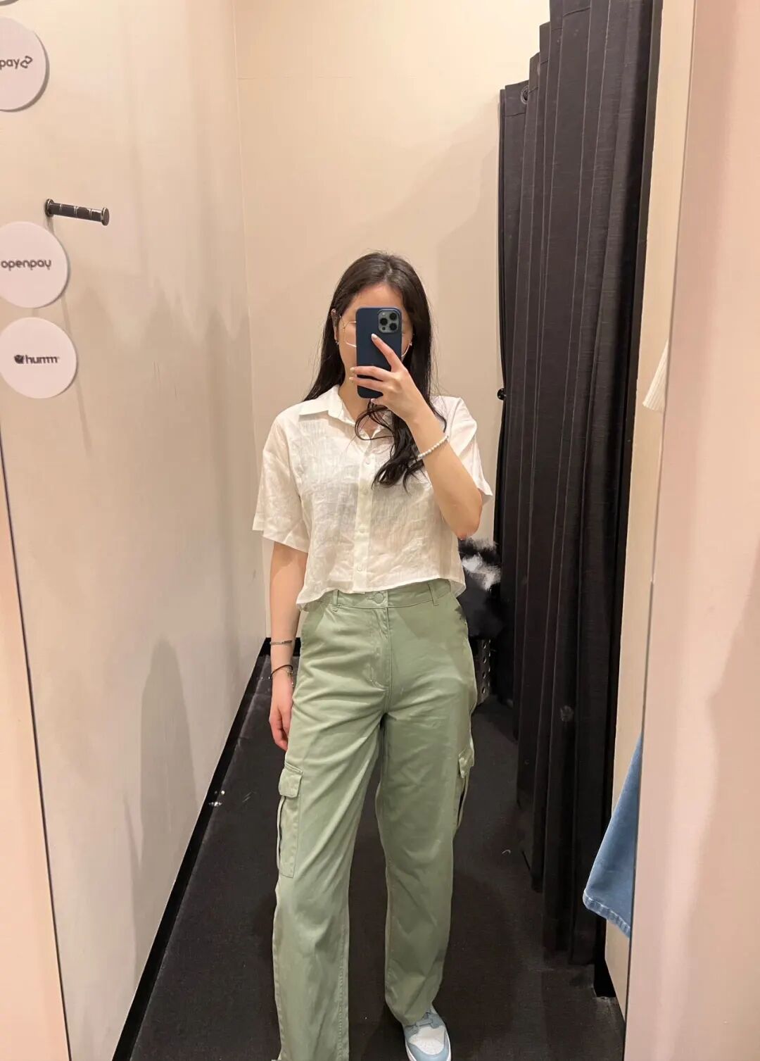 这条工装裤的颜色实在太养眼了,高腰设计是显腿长必备的小心机~而且裤腿上有很多口袋,解放双手,把身上的零碎小物件都装进去啦~