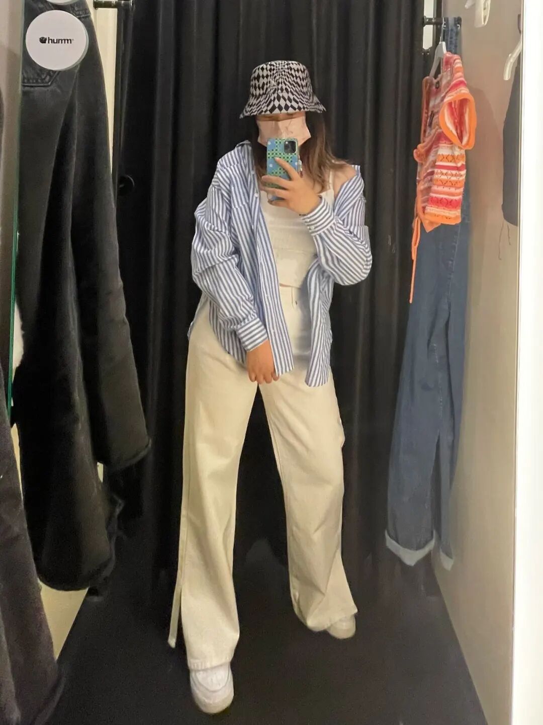清爽的蓝色条纹衬衫舒适又出片,如果怕热,里面可以像墨妮卡一样穿个白色短袖和吊带哦!户外出行,衬衫还可以防晒,两全其美!