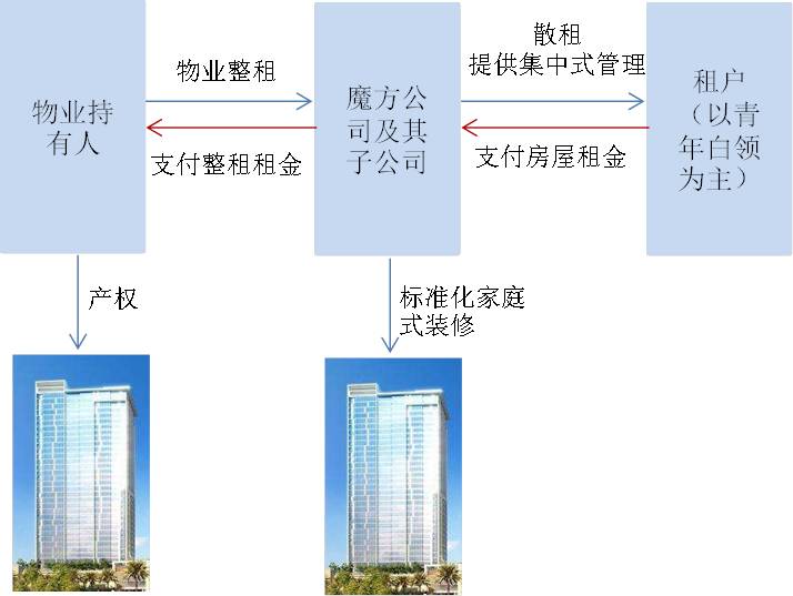魔方中国的主营业务是长租公寓的租赁运营。通过运用较为传统的商业地产运作模式,以独栋商业楼宇为运作标的,采用B2C运营模式,包租后通过对房间进行标准的家庭化装修,配备统一的物业服务,并进行集中式管理,满足青年白领居住社交需求。公司的盈利来源主要是租赁收入和服务收入。具体的运营模式如下图所示。