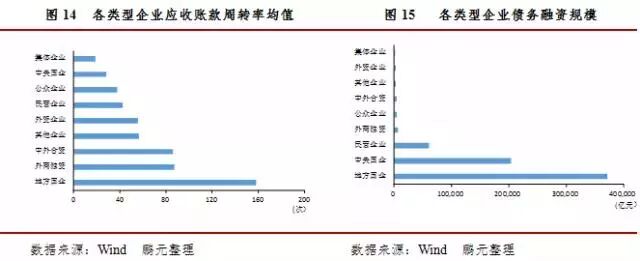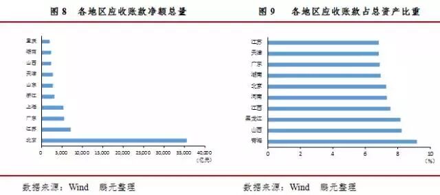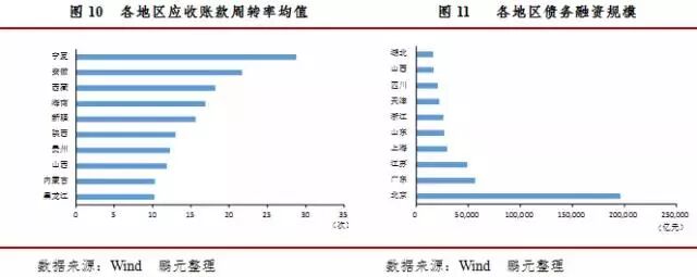 分行业来看,建筑装饰、综合、交通运输、采掘、机械设备、公用事业、房地产等行业的应收账款规模净额总量均较大,盘活应收账款进行融资的空间较大;分区域来看,2016年末北京地区债券发行人的应收账款净额遥遥领先于其他省市,而后是江苏、广东、上海、浙江等省份,均为东南沿海地区经济活力较高的区域;从企业性质来看,以国有企业的应收账款净额总量最高。此外,从城投债与产业债角度来看,城投债的应收账款净额与债务融资余额的比值高于产业债,因此城投公司盘活应收账款对改善债务融资结构更具效用。