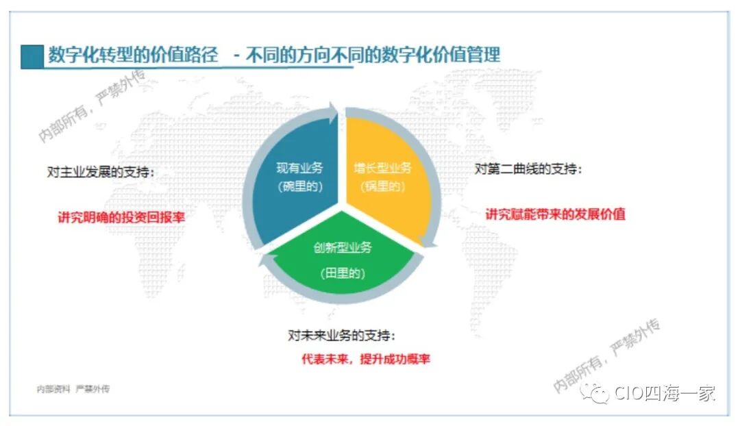 管理数字化转型三个不同类型的使命,对应三个业务领域,不同的方向对应不同的数字化价值管理。
