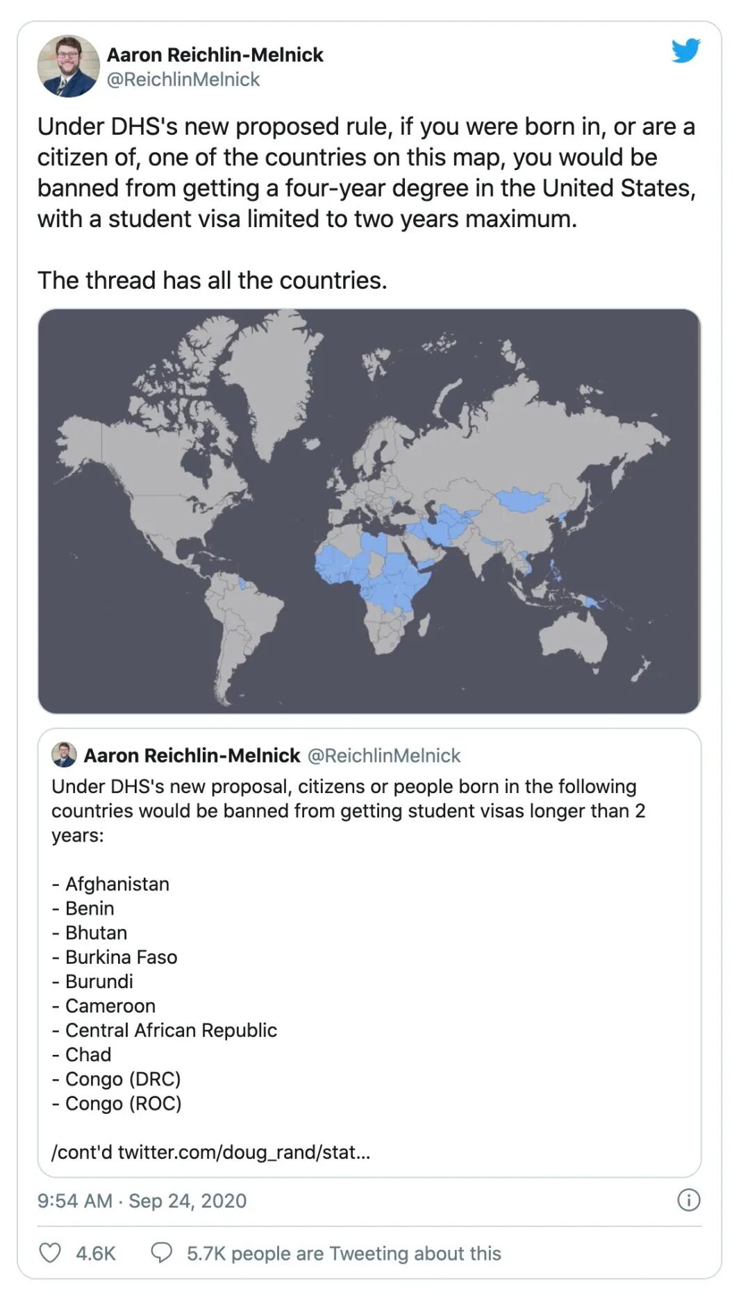 具体来说,出生在被定义为支持恐怖主义国家的国家的学生(包括伊朗、朝鲜、苏丹和叙利亚),或者学生签证和交流访问签证逾期逗留率超过10%的国家的公民(包括菲律宾和越南等),只能获得两年签证,然后必须申请延期。根据《华尔街日报》对国土安全部数据的分析,这会影响59个国家的学生,其中36个国家在非洲,另外一小部分在亚洲。例如,一个在伊朗出生、在英国长大、现在是英国公民的学生,仍然只能获得两年签证。
