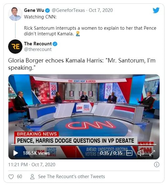 (在CNN直播节目中)里克·桑托勒姆(Rick Santorum)为了解释彭斯没有打断卡马拉而打断了女主持人。