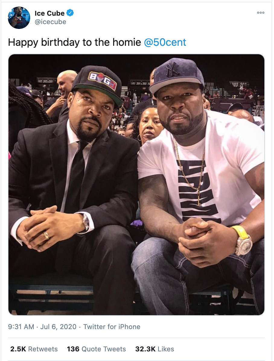 在原本的照片中,两位说唱歌手都戴着印有体育标志的棒球帽。Ice Cube戴着一顶写着“Big 3”的帽子,50 Cent则戴着一顶有纽约洋基队标志的帽子。7月6日,Ice Cube在自己的推特账户上分享了这张原始照片,为50 Cent送上生日祝福。