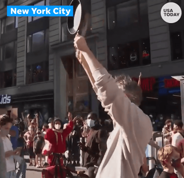 一些纽约客冲出公寓,开始在街上跳舞。另一些纽约客加入进来,敲打着锅碗瓢盆,叮叮哐哐。一个男人,在布鲁克林的一个街区中间,“嘭”地打开了香槟。这是纽约的周六,所有的主流媒体都宣布了前副总统小约瑟夫·拜登(Joseph R. Biden Jr.)赢得总统大选的消息。纽约的大街小巷都爆发了庆祝活动。这样的欢呼声,不免让人回想起就在疫情爆发的头几个月里,每天晚上7点在这座城市的上空准时迸发的欢呼,那时节的纽约客们,含着热泪,为在抗疫一线的工作人员们鼓掌、感谢、加油、欢呼。在布鲁克林的展望公园(Prospect Park),喜悦在蔓延。30岁的网络开发人员贾斯汀·奥克利(Justin Oakley)说:“我感觉自己一直在屏住呼吸。我们经历了这么多,这座城市今年也经历了这么多,我经历了这么多抗议活动。但是现在,啊,现在,终于有值得庆祝的事情了。”“战斗还没有结束,”奥克利补充说。“但是,伙计,现在感觉好极了。”不远处,一个跑步的女孩突然停了下来。她看到手机里传来的消息时,尖叫道:“哦,我的上帝,哦,我的上帝,我真不敢相信!”“相信吧,相信吧!”一个骑着自行车的人冲着她大声喊道,按响了车铃。展望公园里,数百人爆发出掌声和呼喊。布鲁克林医院中心(Brooklyn Hospital Center)的一名医科学生,26岁的凯文·拉穆罗(Kevin La Moureaux),靠在布鲁克林展望高地(Prospect Heights)的弗拉特布什大道(Flatbush Avenue)的一根电线杆上,冲着按喇叭的司机大喊:“让我们开始吧!”。拉穆罗说:“我是一名注册共和党人;这是我第一次投票给民主党人,感觉好极了。”他说,“我只想要正常。我只想要文明。”这是一个阳光明媚、天气温暖的日子,成千上万的人涌向时代广场,欢呼声,一波又一波地穿过人群。人们呼喊着:“U.S.A.!U.S.A.!U.S.A.!”而另一句流行的口号同样在广场上回荡着:“川普,你被炒了!”布朗克斯区曼哈顿学院(Manhattan College)的两名18岁的新生,克里斯蒂娜·迪亚兹(Cristina Diaz)和玛迪·西费特(Maddie Siefert)跑到时代广场来参加庆祝活动。西费特来自康涅狄格州,而迪亚兹则是一位崭新的纽约客,她今年才从佐治亚州来到纽约。她站在人行道上,口罩遮不住她脸上洋溢的笑容。她说,她的家乡在阻止川普总统连任过程中所扮演的角色让她感到自豪。“佐治亚州长期以来都是红色的,现在就像美梦成真一样,”迪亚兹说。“这次终于不用再把佐治亚州看得很糟糕了,太好玩了。”欢欣的纽约市民(Contributor:《纽约时间》的朋友,Connie)川普是土生土长的纽约人,他在纽约市的房地产行业获得了成功,但纽约市的大多数地方,都非常不欢迎这位老乡。在哥伦布广场,数千人聚集到街上,在川普国际酒店脚下唱歌、跳舞、挥舞旗帜。这次集会原计划为抗议游行,要求清点每一张合法选票,但很快变成了一个大派对。音箱播放起了皇后乐队(Queen)的《我们是冠军》(We Are the Champions),还有超级男孩(N Sync)的《拜拜》(Bye Bye Bye)。开车的人也停下车,下车跳舞,拍照。在这座城市的许多自由派社区,包括曼哈顿上西区、格林威治村和布鲁克林的褐石社区,街头派对持续了整个下午。在布鲁克林市中心的巴克莱中心(Barclays Center)前,一大群人在跳舞。住在公园坡(Park Slope)的参议员查克·舒默(Chuck Schumer)也加入了他们的行列。一名助手说,舒默在给拜登和众议院议长佩洛西(Nancy Pelosi)打电话时举起了手机,好让他们听到这里的欢呼声。另一群人聚集在川普大厦旁,为他的失败而欢呼。一个人拿着纸板牌子走在街上,牌子上写着:“你被解雇了。”另一个人挥舞着一面美国国旗。