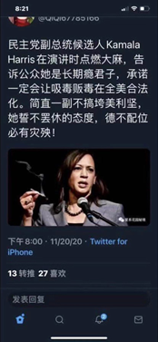 其二称:候任副总统卡玛拉·哈里斯(Kamala Harris)曾在公开演讲时点燃大麻,意将吸毒贩毒在全美合法化。
