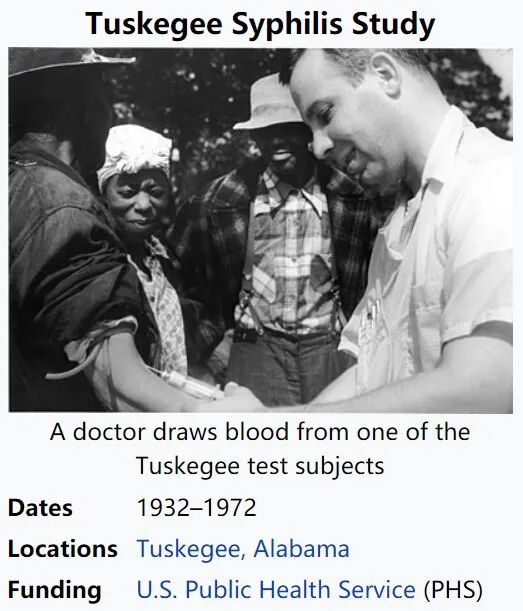20世纪20年代,梅毒是一个重要的公众健康问题,在美国的贫困的黑人居住地大肆流行,高达35%的育龄期居民患有梅毒。1932年起,美国公共卫生部在美国东南部阿拉巴马州的一个贫穷小城——塔斯克吉(Tuskegee)启动了一项人体试验,计划观察男性黑人梅毒患者在未经治疗的情况下,疾病会如何进展。