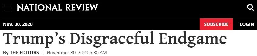 【编者按】美国保守派媒体《国家评论》今日发表社论文章,对川普总统连日以来反复的起诉-被驳回-再上诉进行了严厉的批评,称这些起诉甚至无法经受住“最轻微的审查”;而川普的推特更是充满了“已经被揭穿了的虚假主张和疯狂的阴谋论”。这些行为是“可耻的”。《国家评论》认为,如果川普无法吞下失败的苦果,至少也应该“停止对选举结果所发动战争”。