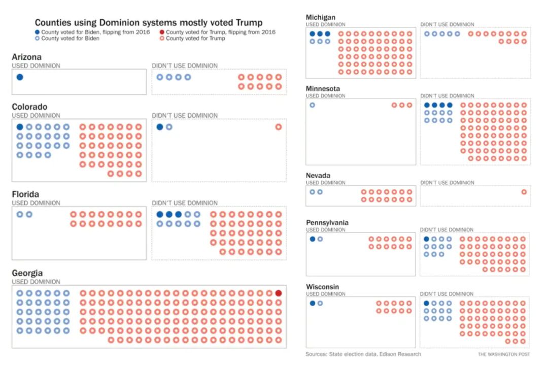 对10个关键州(亚利桑那州、科罗拉多州、佛罗里达州、佐治亚州、密歇根州、明尼苏达州、内华达州、北卡罗来纳州、宾夕法尼亚州和威斯康星州)的审查发现,731个县中,有351个县使用了多米尼系统。其中川普赢得了其中283个县,占总数的81%。而在没有使用多米尼系统的县中,他赢得了79%。