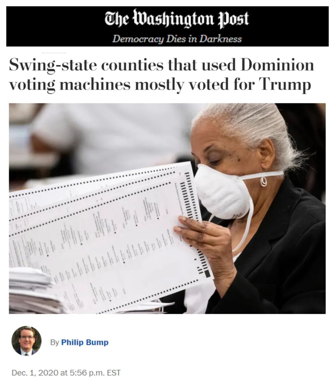 本篇编译自《华盛顿邮报》数据分析记者菲利普·邦普的文章。原题为:《摇摆州用多米尼投票机的县大多都投了川普》。