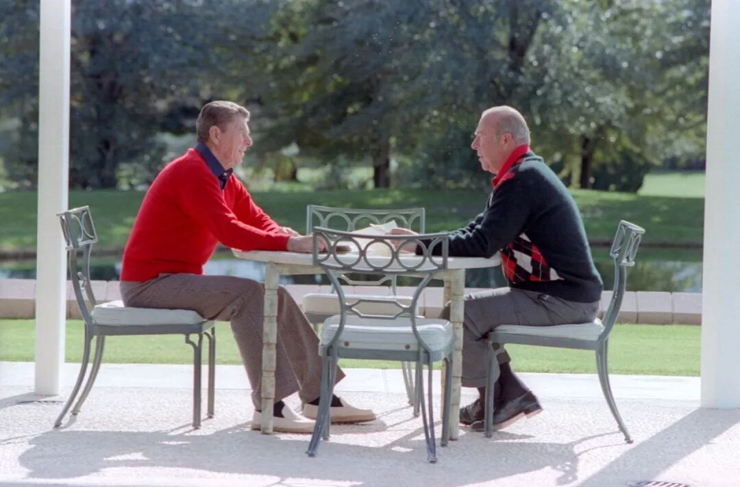 里根总统于1982年在加利福尼亚兰乔米拉奇(Rancho Mirage)的安嫩贝格庄园(Annenberg Estate)会见国务卿乔治·舒尔茨。