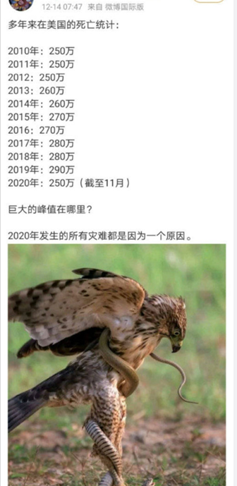 最近的一个爆款热帖从脸书、Instagram、Parler传到了中文社交媒体。这张帖子使用了一张图片,比较了美国最近5-10年间的死亡人数,以此证明新冠根本没有导致美国的死亡人数出现显著不同,因此对新冠的担忧被人为放大,对于社交隔离的呼吁因此也是多此一举。