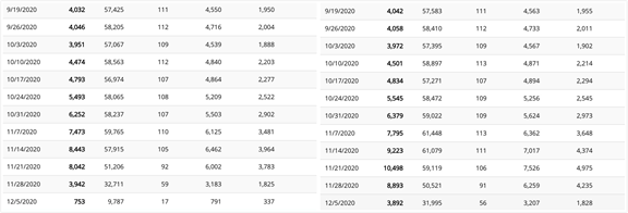 从历史截图来看,最近至少12周的新冠死亡人数和其他各类死亡人数都在不断调整中,下图图左是在12月8日截取的CDC网站临时死亡统计数字,当时为268.5万余人;图右是12月14日的网站截图,死亡数字已经升至274.8万,可以看到,每周人数都有不同比例的上升,尤其是11月28日的那周,仅仅是新冠死亡人数就上调了近5000人,而且预计随着各州数据补充登录,这个数字还会进一步上升。