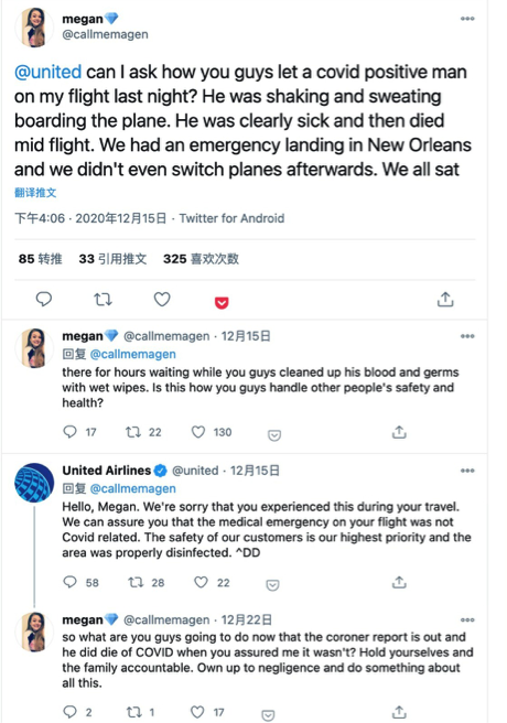 她发推文质问美联航,“你们怎么可以让新冠阳性患者上飞机?”