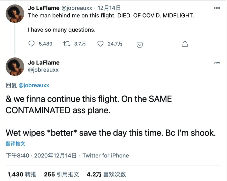 一个叫@jobreauxx 的乘客在推文中称,全飞机的人继续坐同一班被污染的飞机,用到的消毒方式就是湿纸巾。