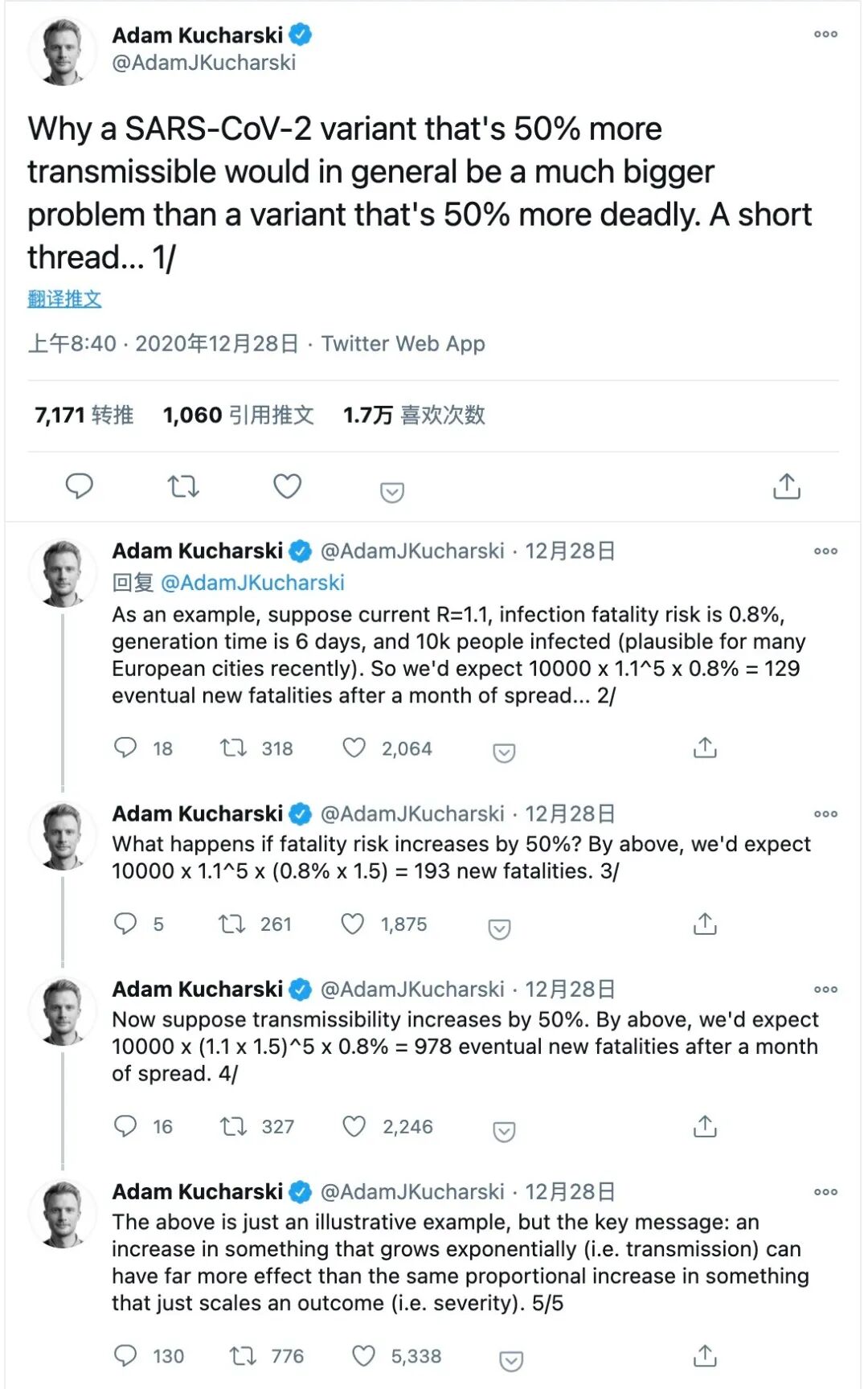 伦敦卫生和热带医学学院的流行病学家亚当·库查斯基(Adam Kucharski)博士是上述变异病毒传染性研究的作者之一,他在推特上做了个简单的计算,用以说明相比致死率增加,传染性增加可能会导致更多的死亡:“指数级增长的某物(比如传播)的增长,可能比同等比例增长的某物(比如严重程度)的影响要大得多。”