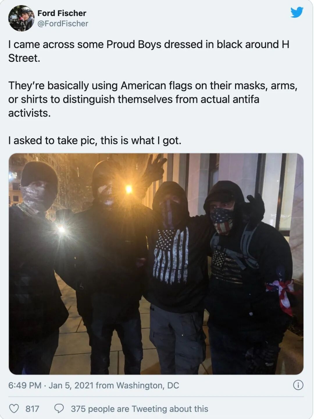 但塔里奥的追随者看来听从了他的建议。多名记者证实在袭击发生的前一天晚上遇到了骄傲男孩,他们穿着深色衣服在华盛顿市区行走。有四名男子同意接受记者的拍照邀请,并确认他们是该组织的成员。