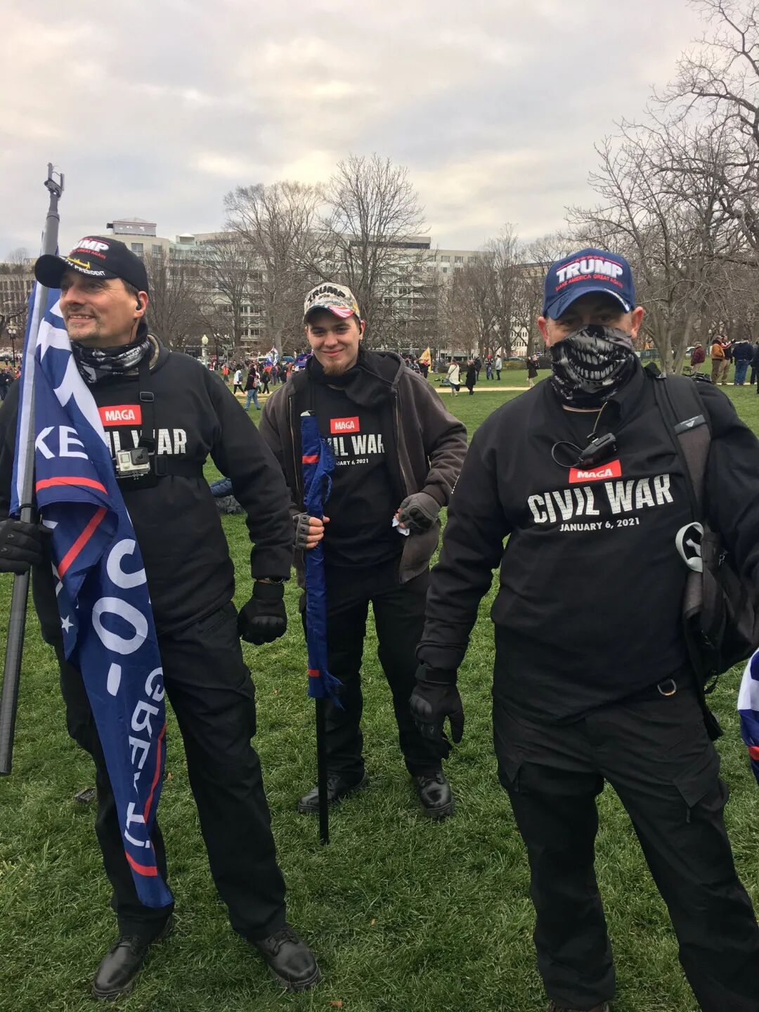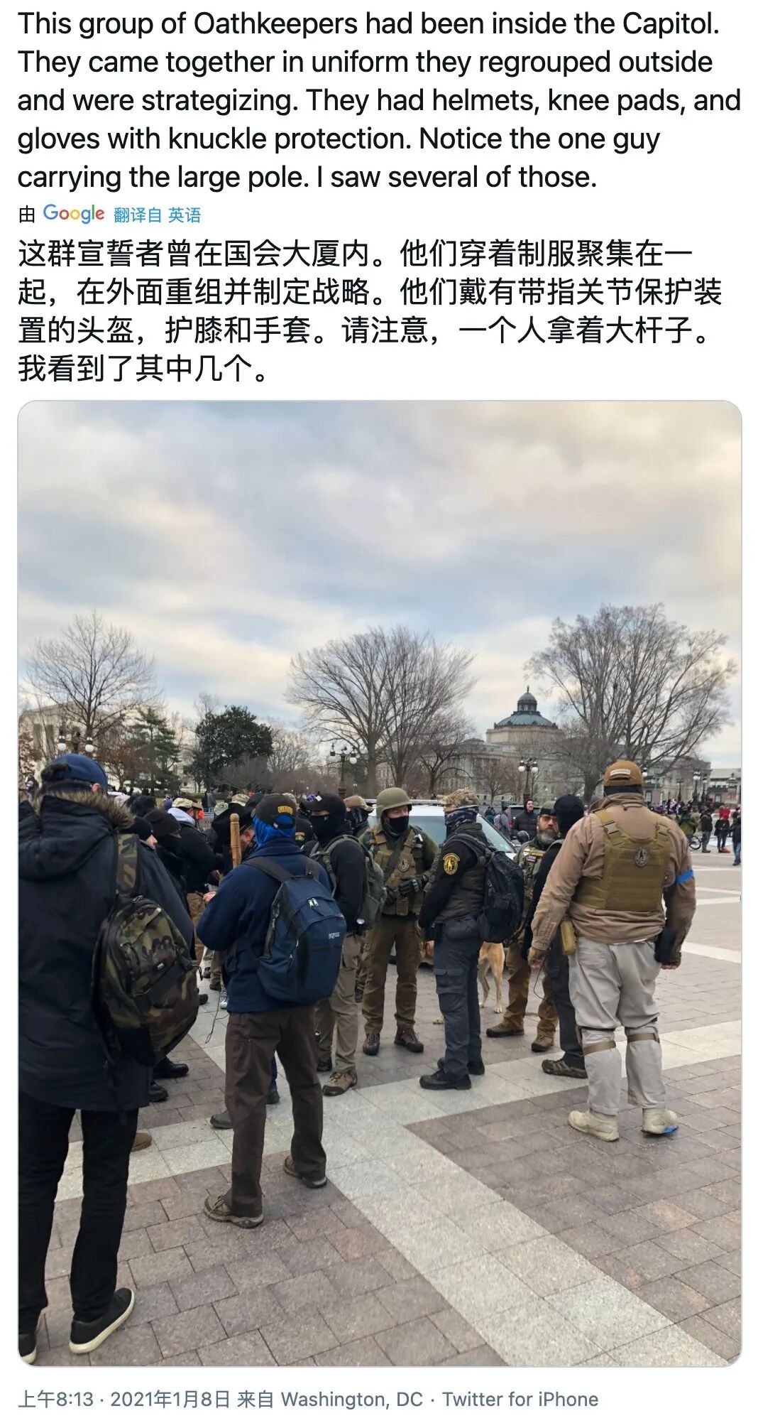 这八名男子的行动被拍了下来,他们是守誓者(Oath Keepers)的成员。守誓者是一个长期存在的民兵组织,承诺要代表川普挑起一场内战。该组织成员加入了涌入国会大厦的抗议者和叛乱分子的行列。当天晚些时候的视频显示,守誓者将一名受伤的同伴拖出大楼。