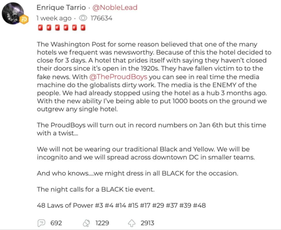一个骄傲男孩在帕勒上描述说,当混乱开始蔓延时,他们鼓励暴徒:“坚守阵地!!……不要回家。我们正处在拯救宪法的边缘。”