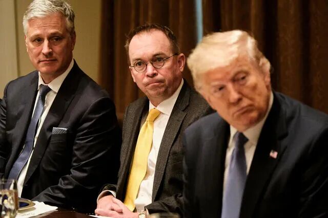 周二下午晚些时候,要求匿名讨论证词的特勤局官员表示,川普的保护小组负责人罗伯特·恩格尔(Robert Engel)和那辆车的司机都准备在宣誓后声明,两人都没有受到前总统的攻击,也没有伸手去碰方向盘。官员们表示,两人不会否认川普想去国会大厦的指控。 米克·马尔瓦尼(图中)与时任总统川普于2019年在白宫会面。