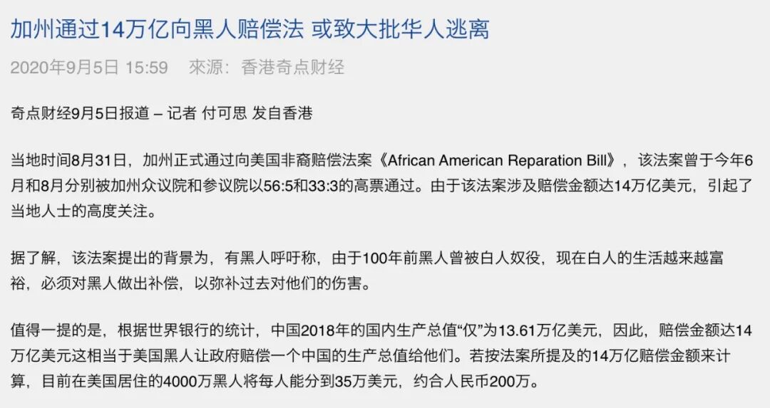 也就是说,这个法案旨在成立一个工作组,研究如何对非裔美国人赔偿建议,并在2023年前向立法机构提出建议,探索该州可能赔偿的方式,赔偿可能是以金钱为方式,也可能包括了奖学金、专项投资等。这离真正整理出“赔偿”费用和措施,得到立法机关的批准通过,获得预算,最后甄别出奴隶后代予以补偿,差距还相当远。但在当时中文媒体就已经声称这个做法可能会带来14万亿的赔偿额,并且将黑人与华人的利益对立,称赔偿黑人就会让华人逃离加州。