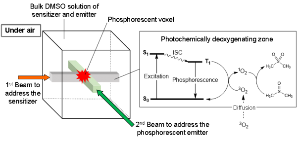 在前期研究工作中,陆为课题组发现了光化学除氧溶液(二甲亚砜DMSO就是一种典型的光化学除氧溶剂)体系中长寿命磷光化合物的光活化磷光发射(PAP)现象(相关论文发表在Angew. Chem. Int. Ed. 2017, 56, 1784;Chem. Commun. 2018, 54, 3907;Chem. Commun. 2019, 55, 4299)。在此基础上,陆为课题组开发了一种基于磷光化合物光活化磷光发射(Photo-activated Phosphorescence, PAP)的立体三维显示系统模型(如图2所示)。在这个模型中,研究人员首先选定了含两种磷光化合物(光敏剂Pt(TPBP)和发射子Pt(OEP))的DMSO溶液,然后再根据这两种磷光化合物的特性对该溶液施加两束激发光束。在针对光敏剂吸收光束的作用下,光敏剂吸收光能产生三重激发态,溶液中的氧气吸收光敏剂三重激发态的能量形成激发态氧(1O2),激发态氧与DMSO反应,生成二甲基砜,从而消耗了溶液中的氧气,进而在光束通过的地方形成一片微环境乏氧的区域(相当于一个虚拟的屏幕);在另一束相对较弱的针对发射子吸收的光束作用下,通过控制这束光的强度,可使其仅在两束光交汇的地方,激活发射子的磷光,从而在两束光交汇的立体空间形成体素点。研究人员采用光谱仪对磷光体像素点进行了充分的表征,验证了磷光化合物光活化磷光发射体3D显示用于实际的可能。![]()