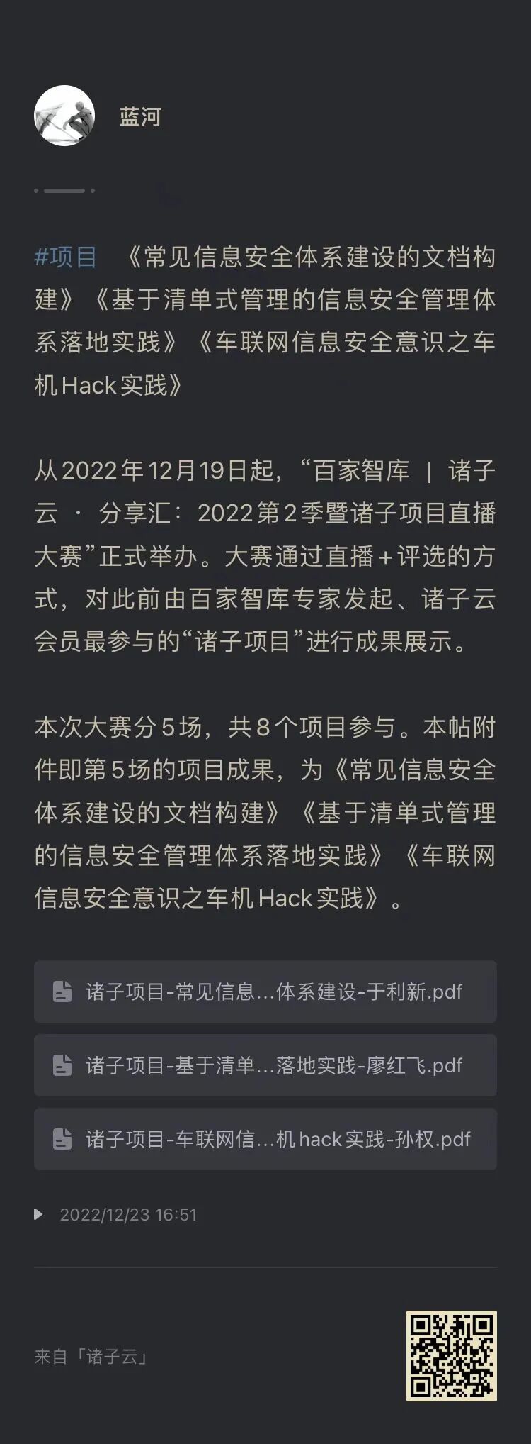 本次项目《常见信息安全体系建设的文档构建》《基于清单式管理的信息安全管理体系落地实践》和《车联网信息安全意识之车机Hack实践》诸般材料已经上传至诸子云知识星球。通过下方图片中的二维码,即可开启传送门。