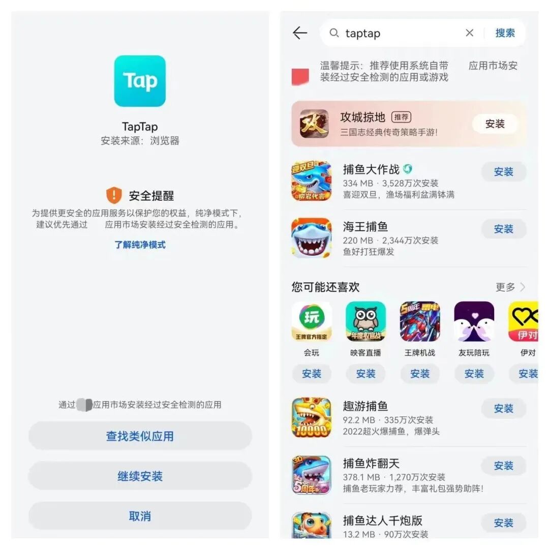 在这之前,国内手机厂商对于第三方应用商店的态度也大多与苹果相同,也陆续学习苹果推出了类似的“纯净模式”,以“安全”为理由,对第三方应用商店及下载的App有多项干扰拦截,包括不限于屏蔽搜索(找不到第三方商店)、安全提醒(频繁提示风险)、导流(引流到自带的应用商店),增加安装难度(需要验证账号、输入密码)等行为,目的就是让用户在繁琐的操作中放弃安装第三方应用,保证“生态安全”。为此,手机厂商和第三方应用商店不惜对簿公堂,包括豌豆荚、应用宝、Taptap也有过多次和手机厂商之间关于App安装拦截的诉讼。