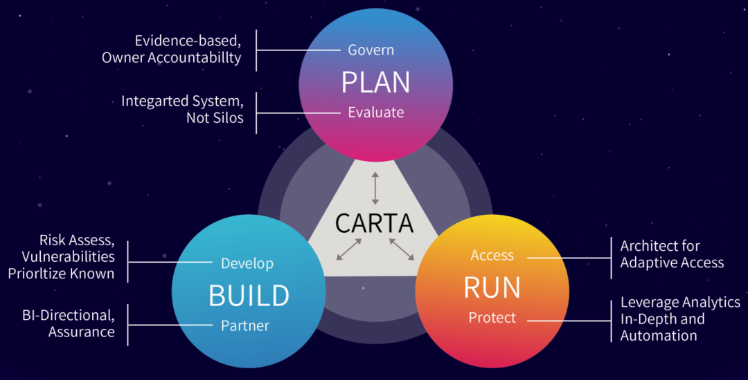 作为DevSecOps敏捷安全技术实践的最高层,也是DevSecOps敏捷安全体系建设的终极愿景,连续三年被CARTA占据。CARTA(Continuous Adaptive Risk and Trust Assessment,自适应风险与信任评估)从规划、构建、运营三个维度动态评估企业的数字化业务在整个软件全生命周期中面临的风险和信任,不追求零风险,不要求100%信任,持续构建一个信任和弹性的研运一体化安全环境,使得企业组织能够敏捷地、和业务共生地、持续进化地参与到软件供应链安全建设和保障中去。