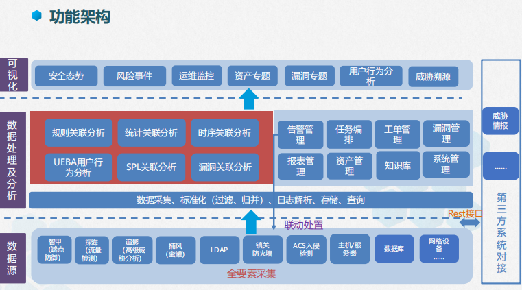 赛克蓝德产品价值,在综合性上,具备日志审计、流量审计、数据库审计、漏洞管理、威胁情报等综合能力,优势互补,全面、深入洞察全网安全威胁态势;在专业性上,具备UEBA用户异常行为分析,可识别内网安全威胁,SPL语法可实现从数据获取、分析、可视化整个过程的描述,而后解析可实现按需解析;在开放性方面,支持REST接口开放,扩展自定义功能,并能基于原生ES底层存储,方便灵活扩展ES应用组件和二次开发,同时支持对接Splunk、Arcsight等产品协同工作。