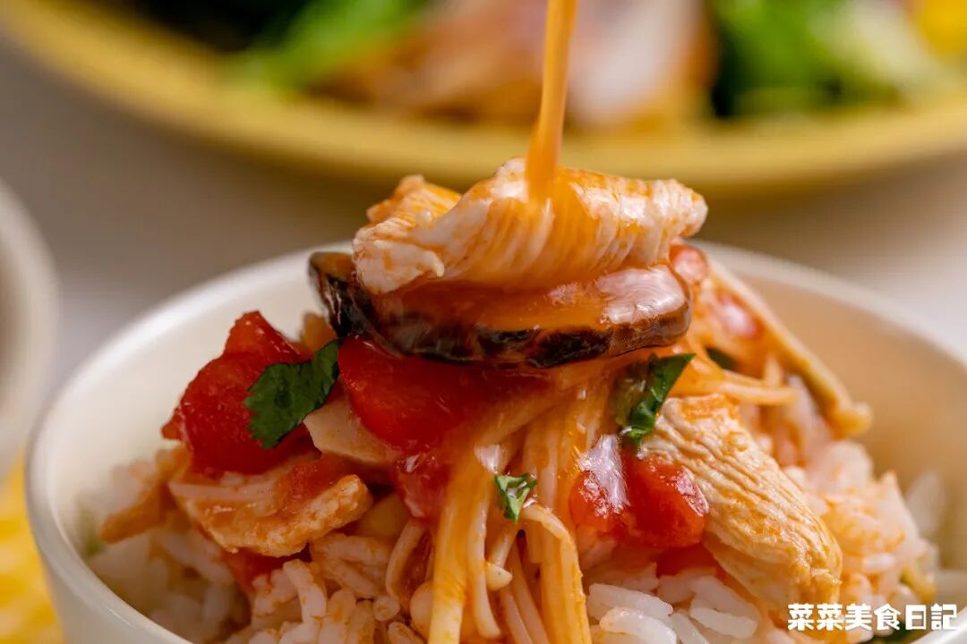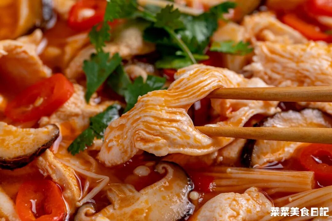 食材嘛,稍微多一些,才对得起“活色生香”的形容。👇首先,将腌渍好的鸡胸肉,洗净切片,加入1小勺淀粉和1个蛋白锁住肉汁。然后,起锅倒入少许油,煸香姜蒜,加入番茄罐头、蒜剁椒酱翻炒出汁。接着,倒入300ml清水煮沸,加1小勺蚝油、1小勺盐、1小勺糖调味,放入菌菇煮1-2分钟。最后,调到最大火,加入鸡胸肉片打散,大火煮个60-90秒,起锅,撒上香菜、红尖椒和花椒油。鸡胸肉只烫了一分钟,嫩滑到不行,风味真心不输水煮牛肉。