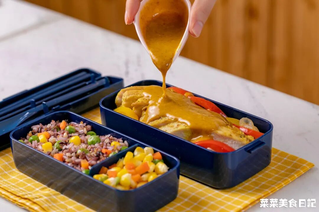 洋葱天然就带着甜,提供味道的同时,其中的蛋白酶也可以起到嫩化肉质的作用。香甜口的鸡胸肉,我喜欢夹到饭团里吃,或者做成借鉴东北菜包饭的吃法。一顿饭所需的优质蛋白质、多种蔬菜、粗粮碳水,一个小口袋就能囊括。咖喱粉混合酸奶,化身流动的“黄金”,给不施粉黛的鸡胸肉抹上浓妆,身子更娇软,魅力值狂飙。追求惹味的小伙伴,可以再浇一份咖喱酱,只是这米饭的量嘛,怕是控制不住咯~