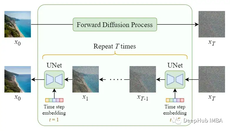 正向扩散过程逐步对输入图像 x₀ 加入高斯噪声,一共有 T 步。该过程将产生一系列噪声图像样本 x₁, …, x_T。