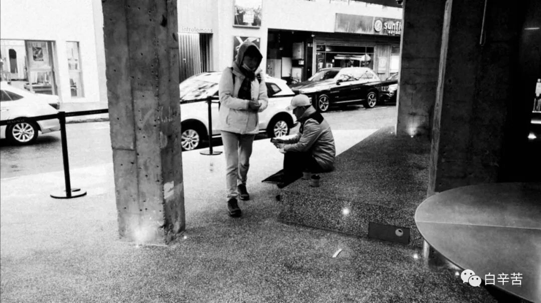 下午三点多,雨正下着,武康路走来一对老夫妻,男人打着伞,戴了顶鸭舌帽,口罩挂在手腕上,女人左手拿着把伞,右手拿着一杯咖啡,跟在后面。