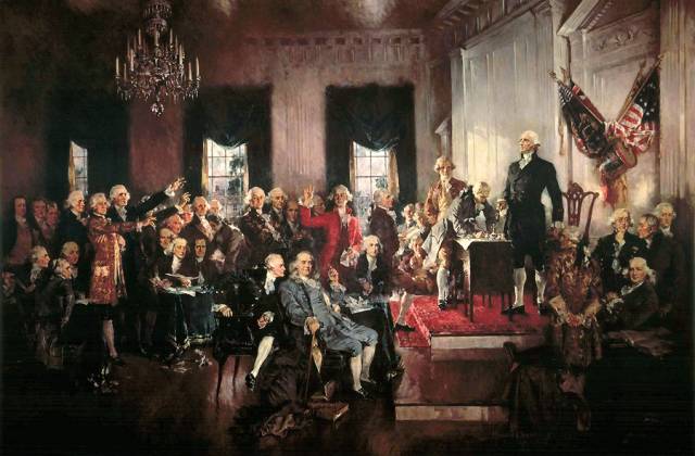 各州只好派出代表,开会讨论解决之道。这就是历史上被称为“制宪会议”的1787年费城会议。制宪会议开了116天。代表们唇枪舌剑,作为大会主席的华盛顿却一直沉默不语。华盛顿为何不说话?他知道自己的声望,他不想影响任何条款的制订。他以无声方式表明,大会主席与其他制宪代表,政治平等,人格平等,没有高低贵贱之分,大会主席无政治、思想、言论之特权。他把民主意识深深埋进每个美国人的心中。