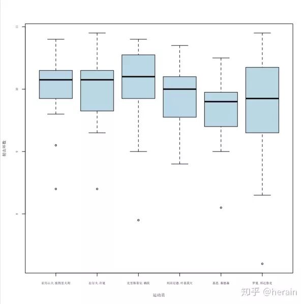 > example2_3 <-read.csv('/Users/MLS/desktop/rs/stt/example/ch2/22_3.csv')> par(mfcol=c(1,1), cex=0.7, family='SimSun')> boxplot(example2_3, col="lightblue",xlab="运动员", ylab="射击环数", cex.lab=0.8, cex.axis=0.6, family="SumSin")