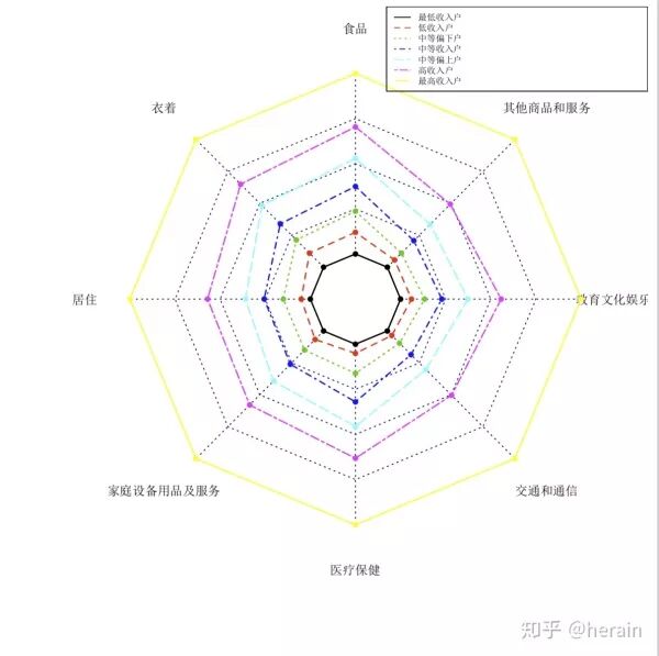 > library(fmsb)> radarchart(example2_5[,2:9], axistype=0, seg=4, maxmin=F, vlabels=names(example2_5[,2:9]), pcol=1:7, plwd=1.5)> legend(x="topright", legend=c("最低收入户", "低收入户","中等偏下户", "中等收入户", "中等偏上户", "高收入户", "最高收入户"), lty=1:7, col=1:7, text.width=1, cex=0.7)