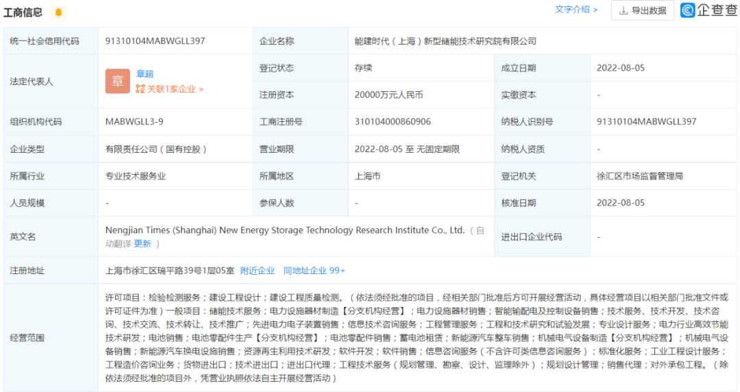北极星储能网获悉,8月5日,能建时代(上海)新型储能技术研究院有限公司成立,法定代表人为章超,注册资本2亿元人民币。该公司经营范围包含储能技术服务、电池销售、电池零配件生产/销售、蓄电池租赁、新能源汽车、新能源汽车换电设施销售等。![]()
