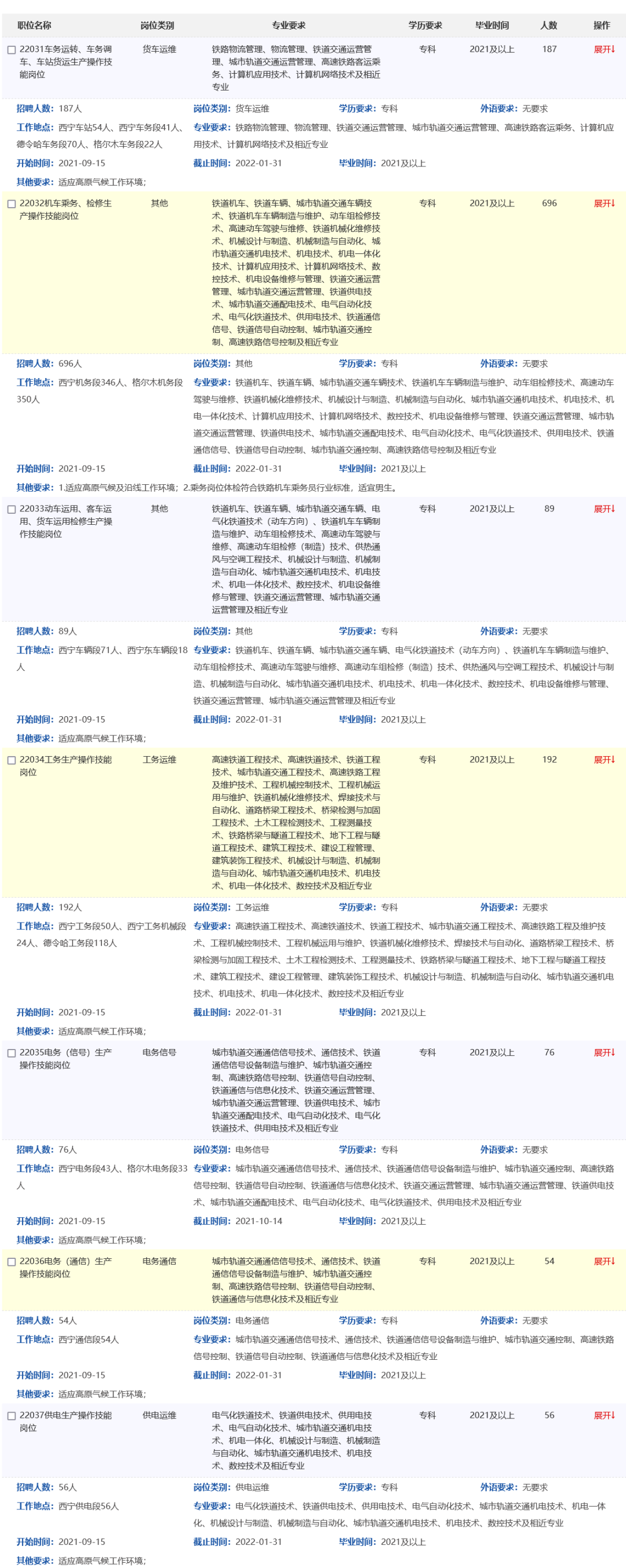 2.符合招聘岗位要求的专业条件,列入国家招生计划、具备派遣资格,2022年和2021年毕业的全日制普通高等院校大专(高职)学历毕业生。在校期间所学专业为铁路方向或所学主要课程中包含铁路专业课程。