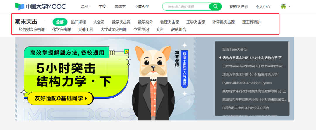 中国大学MOOC“期末突击”模块,有猴博士和各985高校老师的考前突击课程。层层筛选,次次打磨,专为考试定制,只为帮你通过考试。