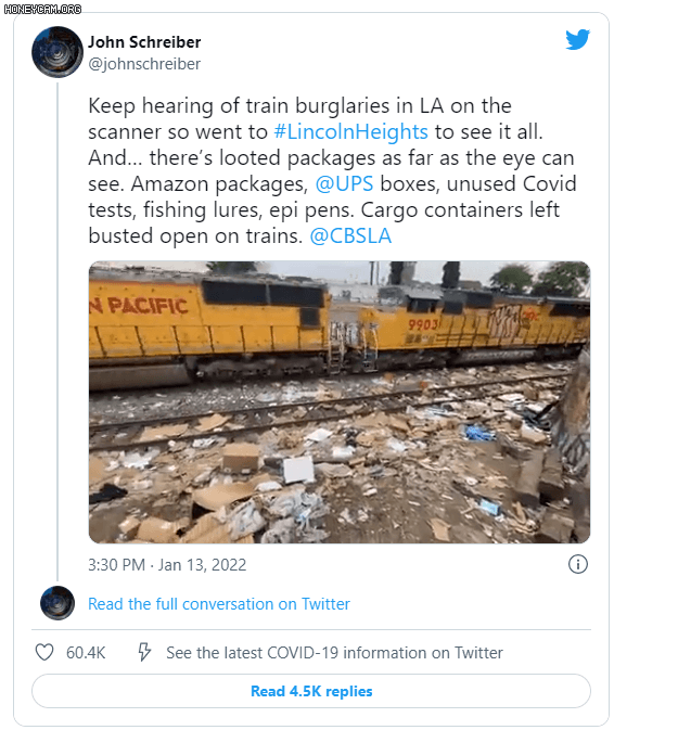 窃贼们大量窃取快递,将空快递箱随手丢弃在铁轨附近,虽清理过数次,但不过几天,铁轨附近就会重新散落数千件被撕烂的快递箱。疯狂火车抢劫案激增,延误了来自亚马逊、UPS配送的家庭新冠检测盒等重要急需包裹的发货。